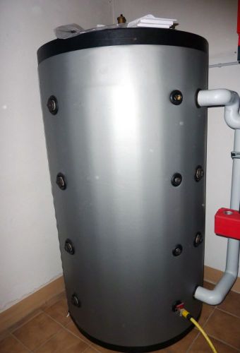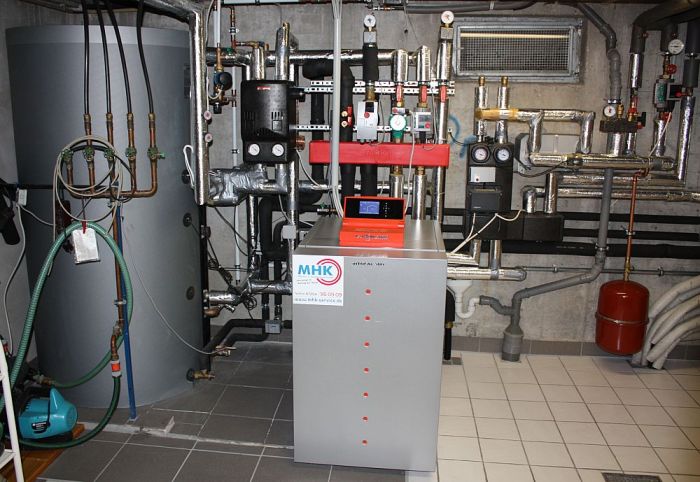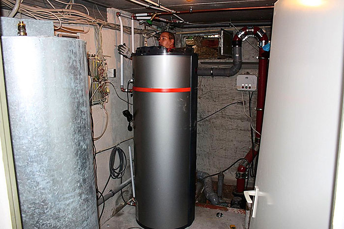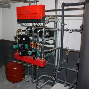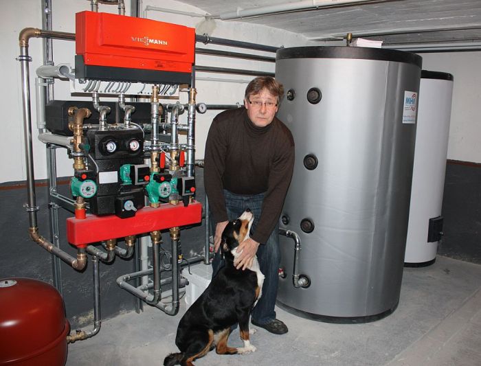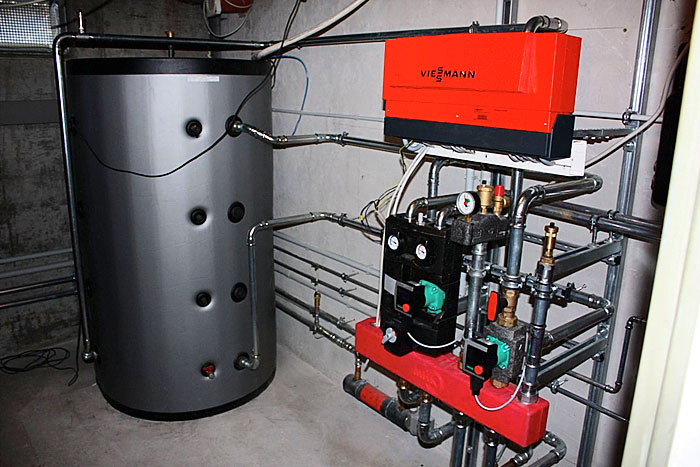 Bei der Heizungssanierung in einem bestehenden Gebäude wurde die alte Ölheizug durch eine Anlage mit der Luft-Wasser Wärmepumpe Vitocal 350 von Viessmann ersetzt. Die Wärmepumpe wurde innen in einem separaten Abstellraum installiert. Sie ist durch eine Wand von der restlichen Installation getrennt. Das Heizungswasser wird in einem 800 l Pufferspeicher gespeichert. Das Brauchwasser wird von der Wärmepumpe erzeugt und in einem separaten Behälter gespeichert.