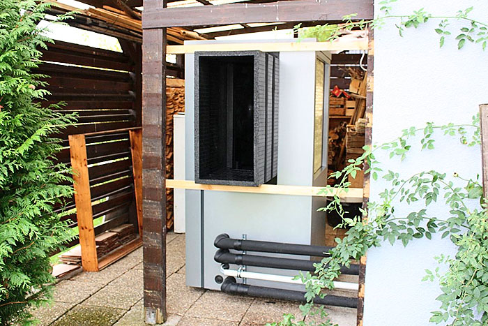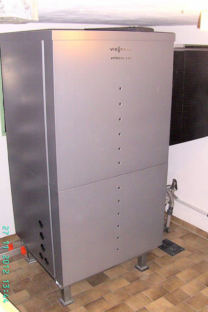 In einem bestehenden Gebäude wurde die Heizung durch eine Luft-Wasser Wärmepumpe Viessmann Vitocal 350 saniert. Das Gerät ist innen in der Ecke eines Kellerraumes aufgestellt und bezieht zu- und Abluft durch große Mauerdurchbrüche. Durch die Eckaufstellung wurde wirkungsvoll die thermische Rückkopplung unterbunden. Über den Zuluftkanal kann keine kalte Abluft angesaugt werden. Das Warmwasser wird durch eine gesonderte Wärmepumpe Viessmann Vitocal 160 erzeugt. Sie gewinnt die die benötigte Energie aus der Raumluft.