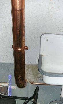 In einem vorhandenem Gebäude wurde eine alte Nachtstrom-Blockspeicherheizung ersetzt. Die stark steigenden Betriebskosten und das Fehlen von Ersatzteilen machte diese Maßnahme nötig. Das Haus wird ausschließlich durch eine Fußbodenheizung erwärmt. So konnte dieser Bereich, außer einer Spülung der über 30 Jahre alten Heizungsrohre und dem hydraulischen Abgleich, ohne Änderung bestehen bleiben. Es wurde lediglich eine Kreistrennung durch einen Wärmetauscher realisiert. Bei der neuen Heizung kam die Luft-Wasser Wärmepumpe Viessmann Vitocal 350 als Modell zur Innenaufstellung zum Einsatz. Die Pumpe wurde aber außenhalb des Hauses an einem geschützten Platz in einem Holzschuppen aufgestellt. Als Wärmespeicher für das Heizungswasser kam ein 800 l Pufferspeicher zum Einsatz. Zur Brauchwassererwärmung kam eine zweite Wärmepumpe mit 300 l Wasserspeicher ( Viessmann Vitocal 160 ) in einem gesonderten Kellerraum zum Einsatz. Diese Maßnahme sichert eine ökonomische Brauchwassererwärmung außerhalb der Heizperiode.